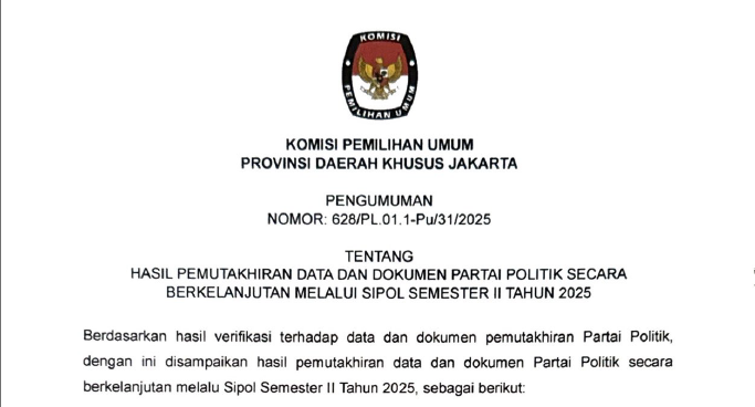 Pengumuman Hasil Rekapitulasi Hasil Pemutakhiran Data dan Dokumen Partai Politik Secara Berkelanjutan Melalui SIPOL Semester II Tahun 2025.