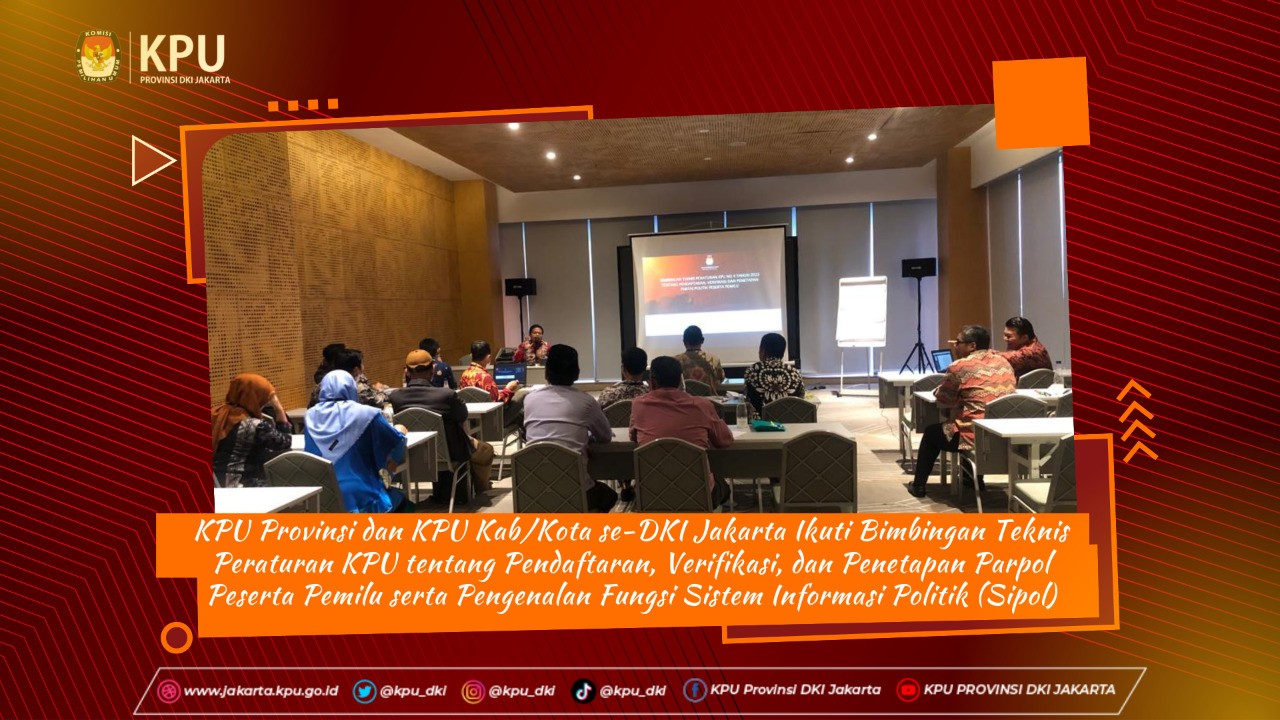 KPU Provinsi DKI Jakarta mengikuti Bimbingan Teknis Peraturan KPU tentang Pendaftaran, Verifikasi, dan Penetapan Partai Politik Peserta Pemilu serta Pengenalan Fungsi Sistem Informasi Politik (Sipol) Kepada KPU Provinsi/KIP Aceh. Bimbingan Teknis yang diselenggarakan oleh KPU RI ini diikuti oleh seluruh KPU Provinsi/KIP Aceh. Acara ini berlangsung pada tanggal 22 sampai dengan 23 Juli 2022, bertempat di Hotel Grand Mercure Harmoni, Jakarta. Kegiatan Bimtek ini dibuka oleh Ketua KPU RI Hasyim Asyar''i, yang dalam sambutannya mengatakan Bimbingan Teknis ini bertujuan untuk menyamakan persepsi dan memberikan pemahaman mengenai regulasi dan kebijakan tentang pendaftaran, verifikasi, dan penetapan partai politik peserta pemilu serta pengenalan fungsi Sistem Informasi Politik (Sipol) kepada KPU Provinsi/KIP Aceh. "Alhamdulillah PKPU pendaftaran, verifikasi, dan penetapan partai politik sudah disahkan, kegiatan ini pada dasarnya bertujuan untuk menyamakan persepsi dan memberikan pemahaman mengenai regulasi dan kebijakan tentang pendaftaran, verifikasi, dan penetapan partai politik peserta pemilu serta pengenalan fungsi Sistem Informasi Politik (Sipo)." ujar Hasyim. Hadir mengikuti dari KPU Provinsi DKI Jakarta yakni, Ketua KPU Provinsi DKI Jakarta Sunardi, Ketua Divisi Teknis Penyelenggaraan Nurdin, Ketua Divisi Data dan Informasi Partono, Kabag Teknis Penyelenggaraan Pemilu, Partisipasi dan Hubungan Masyarakat Binsar Siagian, Kasubbag Teknis Penyelenggaraan Pemilu Nasrullah, serta operator Sipol Moh. Baha'udin Chozini.