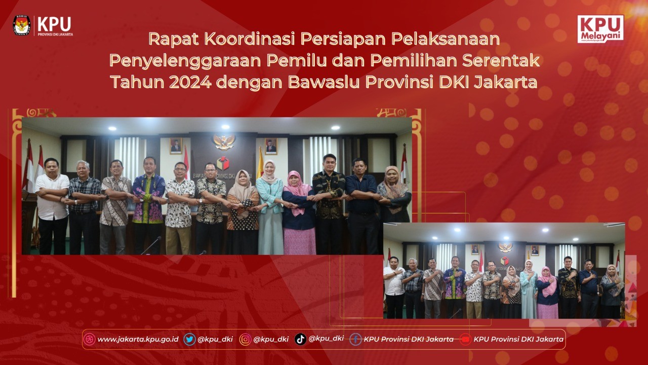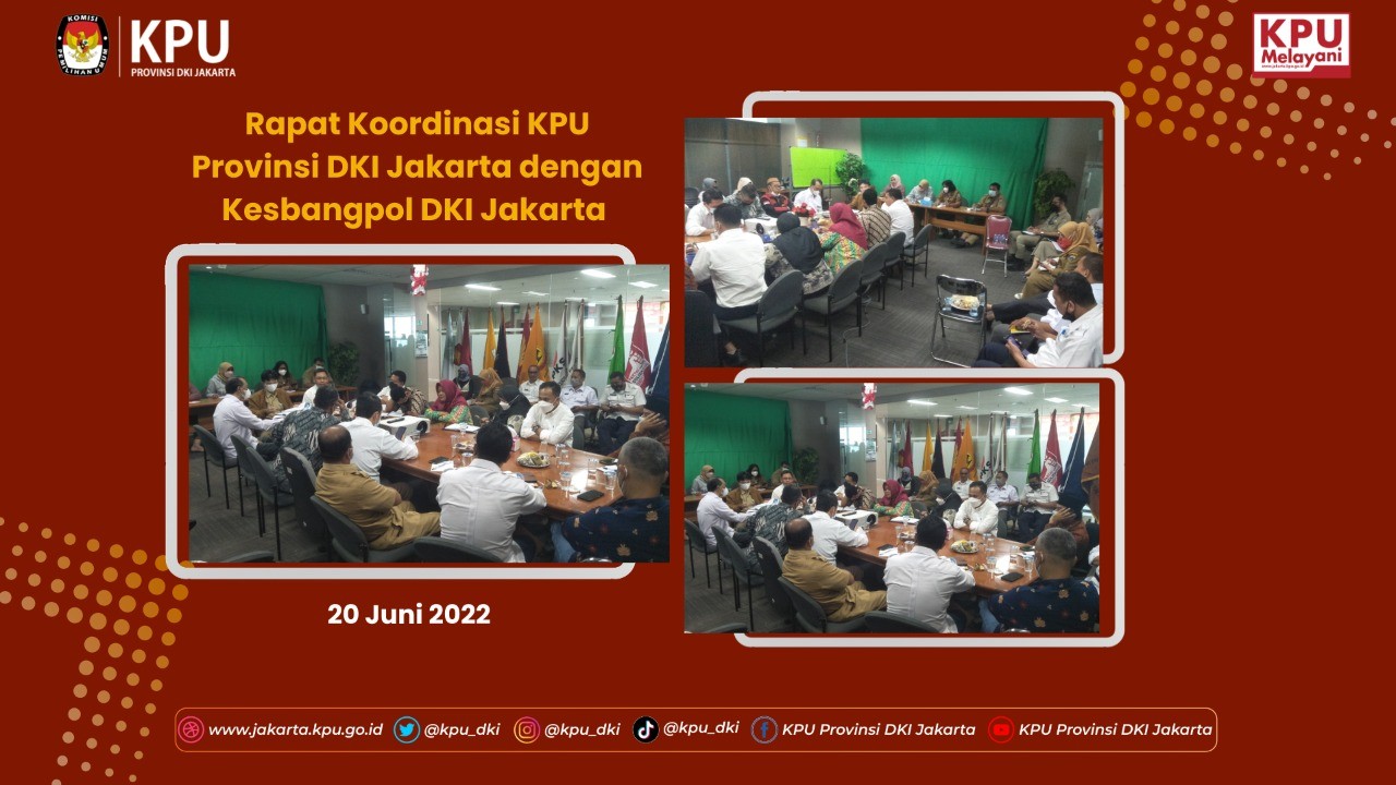 KPU Provinsi DKI Jakarta dan Badan Kesbangpol Provinsi DKI Jakarta pada hari Senin 20 Juni 2022 melakukan rapat koordinasi terkait persiapan pelaksanaan Pemilihan Umum dan Pemilihan Gubernur dan Wakil Gubernur DKI Jakarta Tahun 2024. Rapat koordinasi ini merupakan tindak lanjut dari arahan Gubernur DKI Jakarta saat menerima kunjungan KPU Provinsi DKI Jakarta di Balaikota pada 16 Juni lalu. Seperti diberitakan sebelumnya bahwa dalam rangka mempersiapkan pelaksanaan Pemilukada DKI Jakarta Tahun 2024, Ketua dan Anggota KPU Provinsi DKI Jakarta melakukan pertemuan dan beraudiensi dengan Gubernur Provinsi DKI Jakarta di Balikota Provinsi DKI Jakarta, dan pada saat audiensi tersebut Gubernur Anies menyambut baik dan mengapresiasi terhadap upaya yang dilakukan oleh KPU Provinsi DKI Jakarta. Saat itu Anis pun mengatakan bahwa tahapan akan didukung dan difasilitasi secara penuh agar pelaksanaan Pemilu dan Pemilihan dapat berjalan dengan lancar dan sukses. “Nanti (masalah anggaran) akan ditindaklanjuti oleh SKPD terkait.” janji Gubernur saat audiensi lalu. Rapat koordinasi ini sendiri dipimpin oleh Kepala Bidang Politik dan Demokrasi, T. A. Ngantung yang mewakili Kepala Badan Kesabangpol Taufan Bakri yang berhalangan hadir karena bertepatan dengan agenda di tempat lain. Dalam rapat koordinasi ini Dolvi, panggilan akrab T.A. Ngantung menegaskan kembali apa yang disampaikan Gubernur bahwa Pemprov DKI Jakarta akan mendukung dan difasilitasi secara penuh agar pelaksanaan Pemilu dan Pemilihan dapat berjalan dengan lancar dan sukses. “Pemprov DKI Jakarta melalui Badan Kesbangpol akan memfasilitasi sepenunhya kebutuhan dalam rangka untuk menunjang suksesnya Pemilu Serentak 2024.” Tegas Dolvi. Berbeda dengan saat beraudiensi dengan Gubernur saat itu yang hanya diikuti oleh jajaran KPU di tingkat provinsi, dalam rapat koordinasi dengan Kesbangpol ini selain jajaran di tingkat Provinsi, KPU Provinsi DKI Jakarta juga melibatkan para Ketua dan Sekretaris KPU Kabupaten/Kota se- Provinsi DKI Jakarta. Pada kesempatan ini Sunardi, Ketua KPU Provinsi DKI Jakarta selaku pimpinan rombongan menjelaskan kembali tentang persiapan dan kesiapan KPU Provinsi dan KPU Kabupaten/Kota se-Provinsi DKI Jakarta dalam melaksanakan tahapan Pemilihan Umum serta Pemilihan Kepala Daerah Provinsi DKI Jakarta Tahun 2024. Ketua KPU Provinsi DKI Jakarta itu pun menjelaskan secara detail apa yang akan dan harus dipersiapkan oleh jajaran KPU Provinsi dan KPU Kabupaten/Kota dalam menyelenggarakan Pemilu dan Pemililhan nanti, termasuk sisi teknis penyelenggaraan maupun dari sisi kebutuhan pendanaan, serta pemenuhan sarana dan prasarana yang ada. “Penyelenggaraan Pemilu dan Pemilihan Kepala Daerah nanti akan berkonsekuensi pada tantangan yang kompleks dan dinamis. Salah satunya adalah kesiapan sarana dan prasarana, infrastruktur dan SDM. Termasuk juga sarana teknologi informasi yang pada saat ini menjadi tuntutan masyarakat.” jelas Sunardi. Di akhir pertemuan disepakati akan dilakukan koordinasi lebih lanjut untuk membahas usulan kebutuhan-kebutuhan dalam penyelenggaraan pemilihan umum nanti.