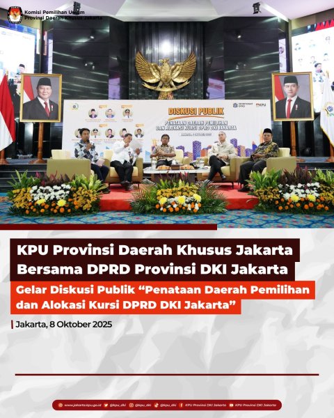 Komisi Pemilihan Umum (KPU) Provinsi Daerah Khusus Jakarta bersama Dewan Perwakilan Rakyat Daerah (DPRD) Provinsi DKI Jakarta melakukan Diskusi Publik dengan tema Penataan Daerah Pemilihan dan Alokasi Kursi Pasca berlakunya Undang-Undang Nomor 2 Tahun 2024, bertempat di Gedung DPRD Provinsi DKI Jakarta, Jakarta Pusat, pada Rabu (8/10).
