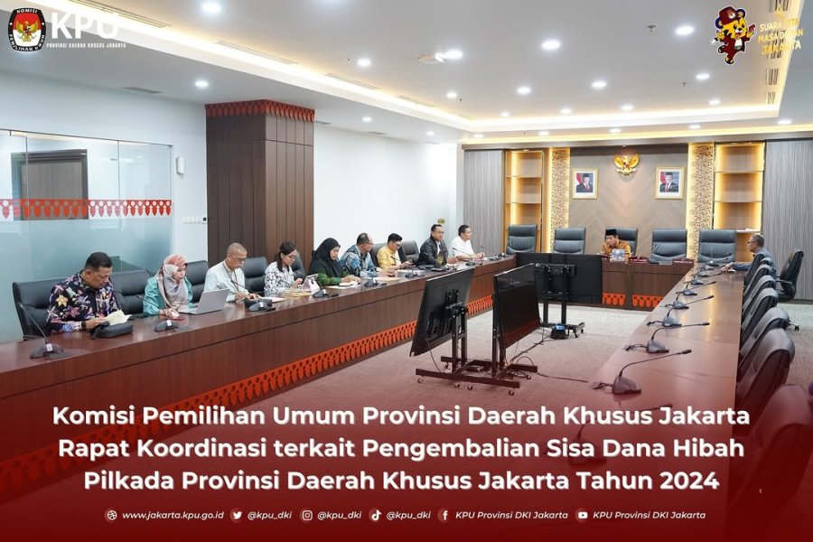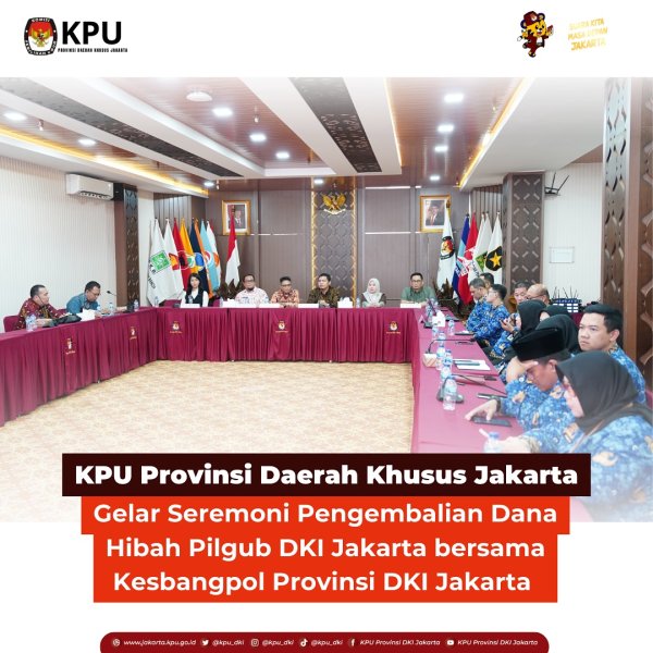 Komisi Pemilihan Umum (KPU) Provinsi Daerah Khusus Jakarta secara resmi mengembalikan sisa dana hibah Pemilihan Gubernur dan Wakil Gubernur Provinsi Daerah Khusus Jakarta Tahun 2024 sebesar Rp 448.155.462.588,- kepada Pemerintah Provinsi DKI Jakarta. Pengembalian dana hibah ditandai dengan seremoni penandatanganan Berita Acara Serah Terima Pengembalian Sisa Dana Hibah penyelenggaraan Pemilihan Gubernur dan Wakil Gubernur Provinsi Daerah Khusus Jakarta oleh Ketua KPU Provinsi Daerah Khusus Jakarta Wahyu Dinata bersama Muhammad Matsani Plt. Kabid Poldem Badan Kesatuan Bangsa dan Politik Provinsi DKI Jakarta di kantor KPU Provinsi Daerah Khusus Jakarta pada Kamis, (17/4/2025). Sebelumnya, dana telah dikembalikan oleh KPU Provinsi Daerah Khusus Jakarta ke kas Daerah Provinsi DKI Jakarta pada tanggal 8 April 2025. Wahyu dalam sambutannya menyampaikan, KPU Provinsi Daerah Khusus Jakarta telah menerima hibah sebesar Rp 975.977.308.550,- dari Pemerintah Provinsi DKI Jakarta untuk pelaksanaan Tahapan Pemilihan Gubernur dan Wakil Gubernur Provinsi Daerah Khusus Jakarta Tahun 2024 baik Putaran I dan Putaran II. "Dari total dana hibah tersebut, realisasi penggunaan anggaran mencapai Rp 527.821.845.962,-, sehingga terdapat sisa dana hibah sebesar Rp 448.155.462.588,- yang dikembalikan sepenuhnya kepada Pemerintah Provinsi DKI Jakarta" kata Wahyu. Dari dana hibah yang diterima, terbagi menjadi 2 (dua) putaran tahapan pemilihan, dimana pada Putaran I sebesar Rp 656.170.587.415,- dan untuk Putaran II sebesar Rp 319.806.721.135,-. Dalam kesempatan yang sama, Matsani turut menyampaikan bahwa Pemerintah Provinsi DKI Jakarta memberikan apresiasi dan penghargaan setinggi-tingginya kepada KPU Provinsi Daerah Khusus Jakarta yang telah melakukan pengelolaan dana hibah selama pemilihan secara akuntabel dan transparan. Sebelum prosesi penandatanganan dan penutupan acara, KPU Provinsi Daerah Khusus Jakarta juga tak lupa menghaturkan secara khusus ucapan terima kasih kepada Pemerintah Provinsi Daerah Khusus Jakarta, Polda Metro Jaya, Kodam Jaya, Pengadilan Tinggi DKI Jakarta, Kejaksaan Tinggi DKI Jakarta, Badan Pengawas Pemilu (Bawaslu) Provinsi Daerah Khusus Jakarta serta semua pihak yang telah bersinergi dalam menyukseskan Pemilihan Gubernur dan Wakil Gubernur Provinsi Daerah Khusus Jakarta Tahun 2024, serta berharap sinergitas tetap solid pada pelaksanaan Pemilu mendatang.