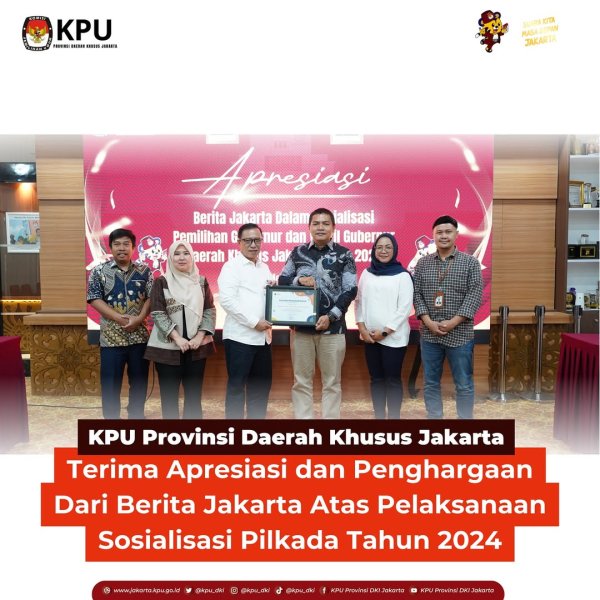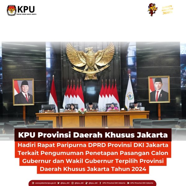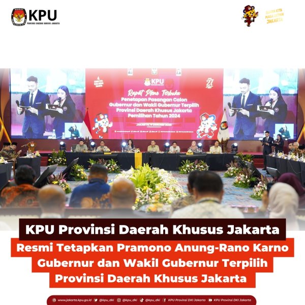 Komisi Pemilihan Umum (KPU) Daerah Khusus Jakarta secara resmi menetapkan pasangan Pramono Anung Wibowo dan Rano Karno (Si Doel) sebagai Gubernur dan Wakil Gubernur Daerah Khusus Jakarta terpilih untuk periode 2025-2030.
