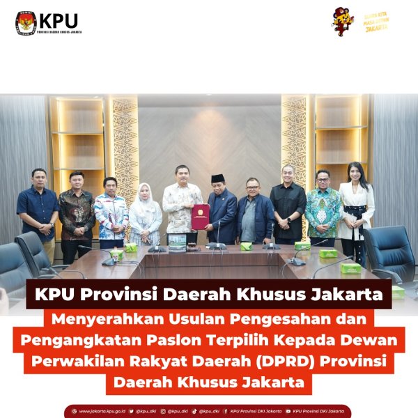 Usai ditandatangani, Surat Keputusan langsung diserahkan oleh Ketua, Anggota dan Sekretaris KPU Provinsi Daerah Khusus Jakarta kepada KPU RI, DPRD Provinsi Daerah Khusus Jakarta, Partai Politik Peserta Pemilu atau Gabungan
