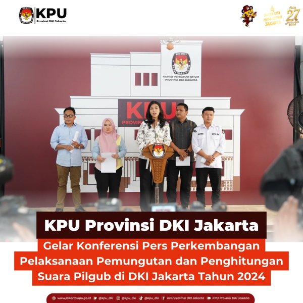 Komisi Pemilihan Umum (KPU) Provinsi DKI Jakarta menggelar Konferensi Pers Perkembangan Pelaksanaan Pemungutan Dan Penghitungan Suara Pemilihan Gubernur dan Wakil Gubernur DK Jakarta Tahun 2024 di kantor KPU DKI Jakarta, Jakarta Pusat pada Kamis, (27/11).