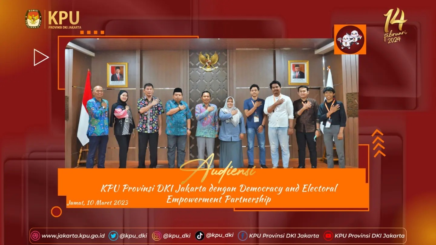 Komisi Pemilihan Umum (KPU) Provinsi DKI menerima audiensi Democracy and Electoral Empowerment Partnership (DEEP) DKI Jakarta di kantor KPU DKI Jakarta, Jakarta Pusat pada Jumat,(10/3). Dalam pertemuan hangat ini, Ketua KPU Provinsi DKI Jakarta Sunardi menyampaikan ucapan terima kasih dan rasa hormat kepada Koordinator DEEP DKI Jakarta beserta rombongan yang telah menyempatkan berkunjung ke Kantor KPU Provinsi DKI Jakarta. "Kami mengucapkan terima kasih untuk DEEP DKI Jakarta sudah hadir dalam pertemuan kali ini, semoga pertemuan ini menjadi awal kolaborasi kita dalam menyukseskan Pemilu 2024 nanti," sambut Sunardi. Dalam kesempatan yang sama, Koordinator DEEP DKI Jakarta Harry Latief menyampaikan bahwa organisasi ini terbentuk dengan tujuan mendorong anak muda untuk dapat ikut berpatisipasi aktif dalam jalannya Pemilihan Umum, khususnya sebagai pemantau. " Kami fokusnya mendorong masyarakat khususnya anak-anak muda untuk dapat ikut serta dan berpatisipasi aktif mengambil peran yang salah satunya menjadi pemantau pemilu," kata Harry. Harry juga berharap agar ke depan bisa menjalin hubungan baik dan kerjasama antara KPU DKI Jakarta dan DEEP DKI Jakarta. "Dengan itu, kami berharap bisa menjalin kolaborasi dengan KPU DKI Jakarta dalam pengawasan pemilu, agar pemilu dapat berjalan sesuai dengan asas penyelenggaraan pemilu dan memperoleh hasil pemilu yang berkualias," sambung Harry. Dalam penutupnya, Sunardi menyampaikan bahwa KPU Provinsi DKI Jakarta mendukung penuh organisasi yang berperan aktif dalam mengawasi jalannya penyelenggaraan pemilu. "Kami men-support penuh teman-teman dalam berpartisipasi aktif memantau jalannya Pemilu," ujar Sunardi. Turut hadir dalam kegiatan, Ketua Komisi Pemilihan Umum Provinsi DKI Jakarta Sunardi didampingi Anggota Marlina, Nurdin, Deti Kurniawati dan Muhaimin, Peneliti DEEP Indonesia Fajri Sahiddinillah, Koordinator DEEP DKI Jakarta Herry Latief, Advokasi dan Hukum Putra Amin, Media, Data dan Informasi Rian Utama, Kabag Teknis Penyelenggaraan Pemilu, Partisipasi dan Hubungan Masyarakat, Kasubbag Parhumas, Pejabat Fungsional Ahli Madya, serta ajaran Sekretariat KPU Provinsi DKI Jakarta.