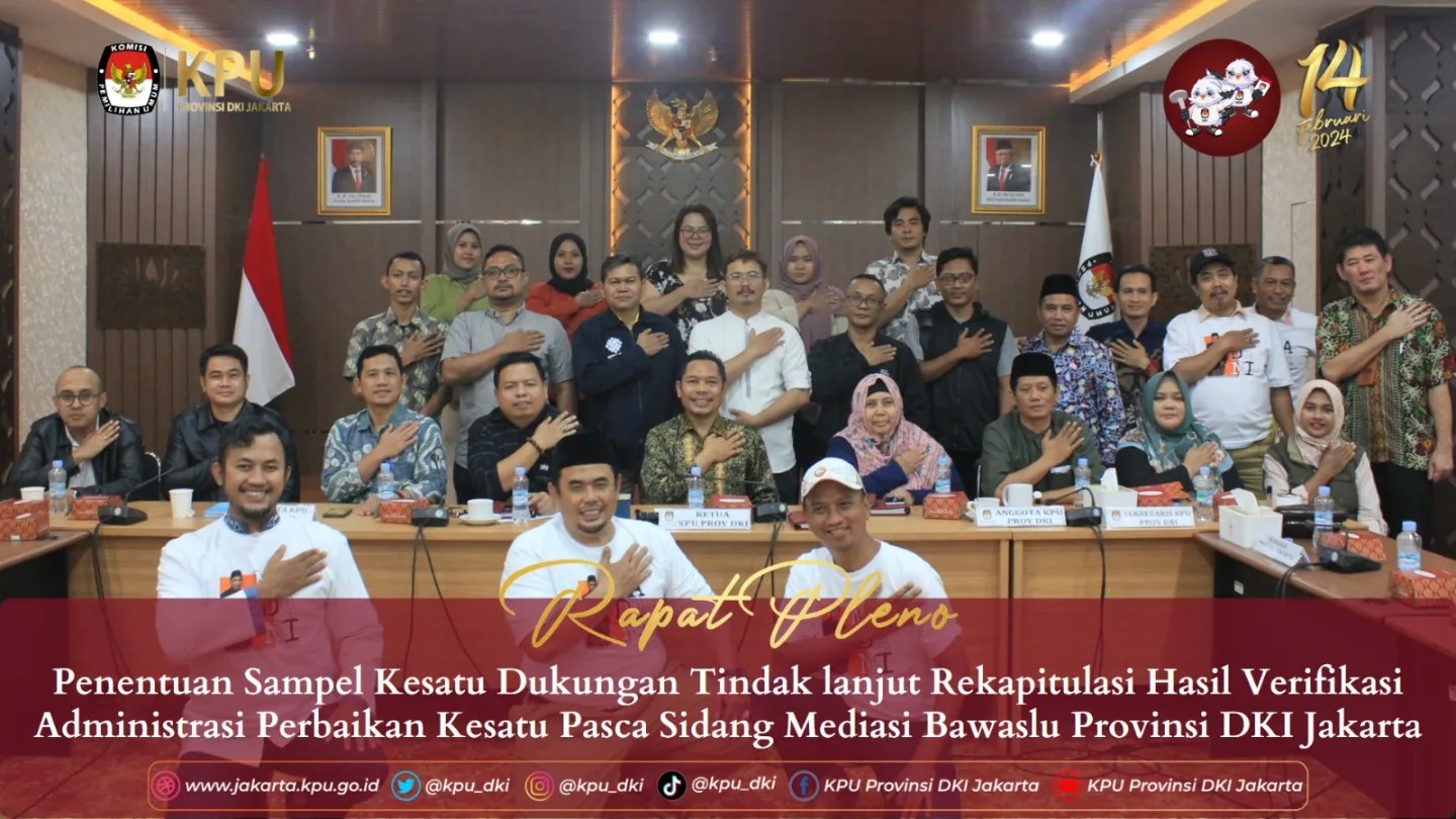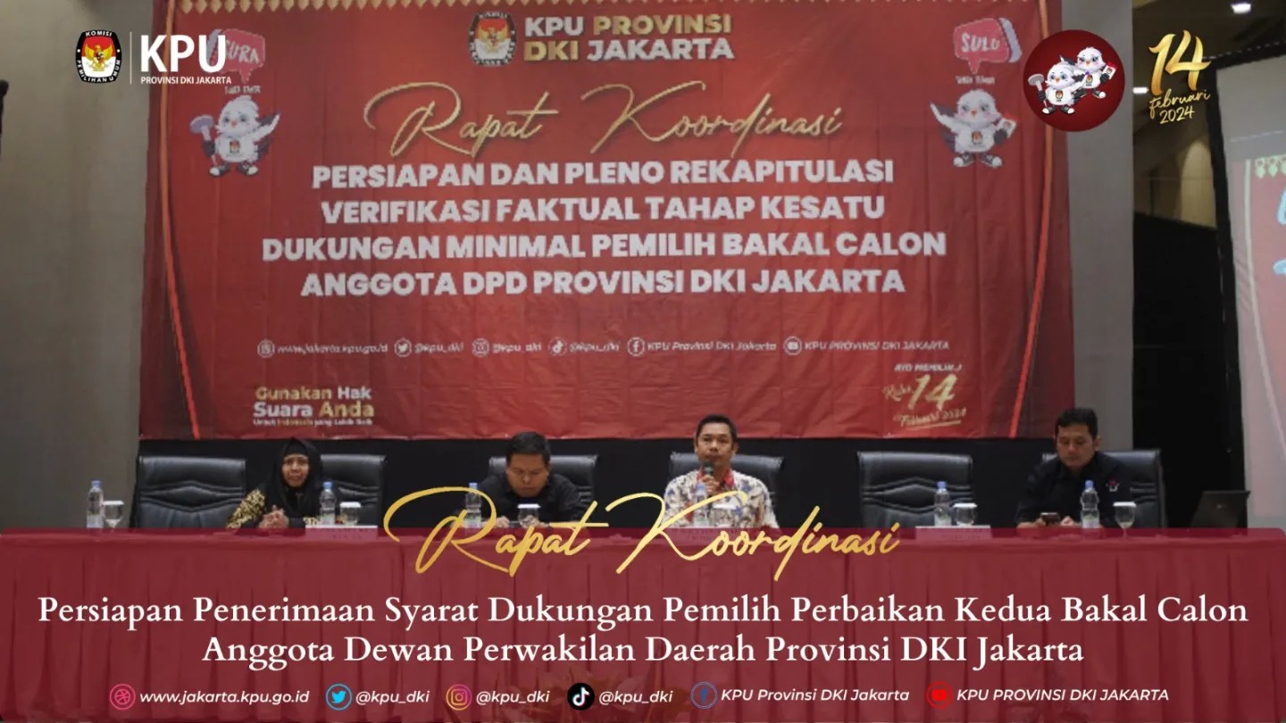 Pasca melaksanakan verifikasi faktual dukungan pemilih bakal calon anggota DPD, KPU Provinsi DKI Jakarta menyelenggarakan Rapat Koordinasi Rekapitulasi Verifikasi Faktual Tahap Kesatu Dukungan Minimal Pemilih Bakal Calon Anggota DPD Peserta Pemilu 2024 pada Rabu (1/3). Rapat koordinasi ini dimaksudkan untuk menyampaikan masalah dan solusi pada proses verifikasi faktual lalu. Dalam sambutannya, Ketua KPU Provinsi DKI Jakarta Sunardi berharap semua Tahapan Pemilu 2024 berjalan dengan baik di seluruh KPU Kota/Kabupaten se-Provinsi DKI Jakarta. "Tentu kami berharap agar semua tahapan pemilu yang sedang berlangsung berjalan dengan baik di KPU Provinsi DKI, maupun Kabupaten/Kota se-DKI Jakarta," jelas Sunardi. Selain itu, Ketua Divisi Teknis Penyelenggaran Pemilu Nurdin menyampaikan apresiasi kepada seluruh Jajaran KPU Kota/Kabupaten se-DKI Jakarta yang telah menyelesaikan tugas dan tanggung jawabnya di satuan kerja masing-masing. "Saya mengucapkan ribuan terima kasih kepada teman-teman KPU Kota/Kabupaten yang sudah menyelesaikan tugas dan tanggung jawabnya, baik Ketua, Anggota, maupun Sekretaris dan Kasubbag. Ini bukan pekerjaan yang mudah karena banyak kendala yang kita temui dalam proses verifikasi," ujar Nurdin. Hadir dalam rakor tersebut Ketua KPU Provinsi DKI Sunardi, Anggota KPU DKI Nurdin, Muhaimin, Deti Kurniawati, dan Partono. Peserta rakor dari KPU Kabupaten/Kota adalah Ketua, Anggota Divisi Teknis Penyelenggaraan Pemilu, Anggota Divisi Hukum dan Pengawasan, serta Jajaran Sekretariat KPU Provinsi dan KPU Kota/Kabupaten se-DKI Jakarta.