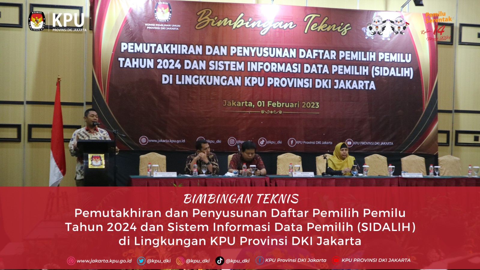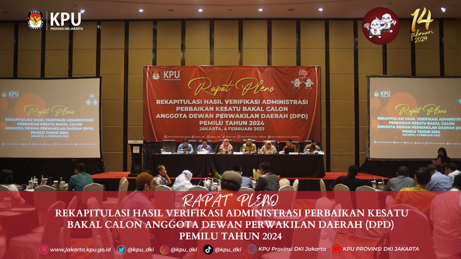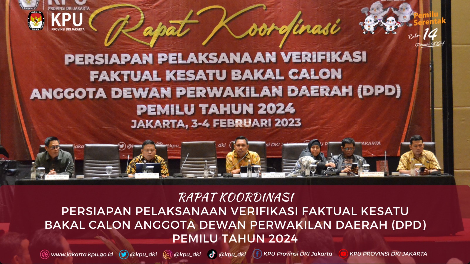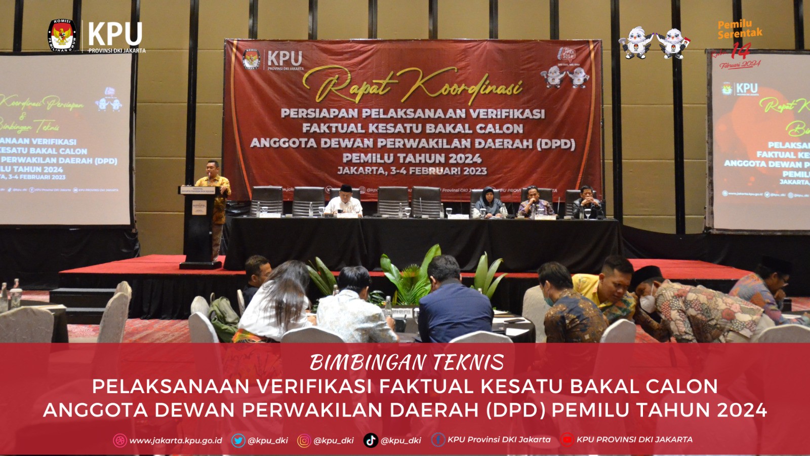 Memasuki tahapan rekapitulasi hasil verifikasi administrasi perbaikan data ke satu bakal calon Anggota Dewan Perwakilan Daerah (DPD) DKI Jakarta pada Pemilu Tahun 2024, KPU Provinsi DKI Jakarta menggelar rapat koordinasi di Lingkungan KPU DKI Jakarta pada Jumat, (3/1). Dalam sambutannya, Ketua KPU Provinsi DKI Jakarta Sunardi berharap semua Tahapan Pemilu 2024 berjalan dengan baik di seluruh KPU Kota/Kabupaten se-Provinsi DKI Jakarta. "Tentu kami berharap agar semua tahapan pemilu yang sedang berlangsung berjalan dengan baik di KPU Provinsi DKI, maupun Kabupaten/Kota se-DKI Jakarta," jelas Sunardi. Sunardi juga mengingatkan bahwa tahapan dalam pembentukan Pantia Pemutakhiran Data Pemilih (Pantarlih) juga menjadi bagian penting untuk KPU se-DKI Jakarta. "Beberapa tahapan yang cukup penting yang harus kita perhatikan antara lain adalah pembentukan Pantarlih," sambung Sunardi. Selain itu, Ketua Divisi Teknis Penyelenggaran Pemilu Nurdin menyampaikan apresiasi kepada seluruh Jajaran KPU Kota/Kabupaten se-DKI Jakarta yang telah menyelesaikan tugas dan tanggung jawabnya di satuan kerja masing-masing. "Saya mengucapkan ribuan terima kasih kepada teman-teman KPU Kota/Kabupaten yang sudah menyelesaikan tugas dan tanggung jawabnya, baik Ketua, Anggota, maupun Sekretaris dan Kasubbag. Ini bukan pekerjaan yang mudah karena banyak kendala yang kita temui dalam proses verifikasi," ujar Nurdin. Hadir dalam rakor tersebut Ketua KPU Provinsi DKI Sunardi, Anggota KPU DKI Nurdin, Muhaimin, Marlina, M. Tarmizi, Deti Kurniawati, Partono, Sekretaris KPU Provinsi DKI Jakarta Dirja Abdul Kadir. Peserta rakor dari KPU Kabupaten/Kota adalah Ketua, Anggota Divisi Teknis Penyelenggaraan Pemilu, Anggota Divisi Hukum dan Pengawasan, serta Jajaran Sekretariat KPU Provinsi dan KPU Kota/Kabupaten se-DKI Jakarta.