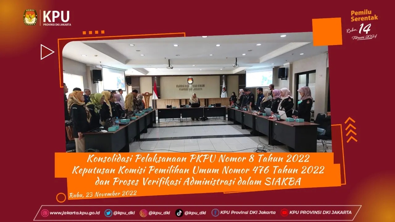 Dalam rangka melaksanakan PKPU 8 Tahun 2022 tentang Pembentukan dan Tata Kerja Badan Ad Hoc Penyelenggara Pemilihan Umum dan Pemilihan Gubernur dan Wakil Gubernur, Bupati dan Wakil Bupati, dan Walikota dan Wakil Walikota, serta Keputusan Komisi Pemilihan Umum Nomor 476 Tahun 2022 tentang Pedoman Teknis Pembentukan Badan Ad Hoc Penyelenggara Pemilihan Umum dan Pemilihan Gubernur dan Wakil Gubernur, Bupati dan Wakil Bupati, dan Walikota dan Wakil Walikota Komisi Pemilihan Umum (KPU) Provinsi DKI Jakarta mengadakan Rapat Konsolidasi Proses Verifikasi Administrasi dalam Sistem Informasi Anggota KPU dan Badan Ad Hoc (SIAKBA). Anggota KPU Provins DKI Divisi SDM dan Litbang Deti Kurniawati dalam sambutan pembukanya menyampaikan bahwa maksud rapat konsolidasi ini untuk menyamakan presepsi terkait persyaratan pendaftaran Panitia Pemilihan Kecamatan (PPK) yang berlangsung pada tanggal 20-29 November 2022 ini. Lebih lanjut Deti menambahkan, dalam proses penyeleksian PPK agar dapat memastikan berkas persyaratan pelamar diteliti secara cermat untuk meminimalisir munculnya celah gugatan dan juga hasil dari setiap tahapan agar diumumkan kepada publik untuk memberikan kesempatan bagi masyarakat menyampaikan tanggapan. Berdasarkan pantauan Operator SIAKBA di masing-masing KPU Kota/Kabupaten, calon PPK yang sudah mendaftar masih terdapat kekurangan berkas yang tak lain adalah Surat Keterangan Sehat Rohani dan Surat Pernyataan yang memuat 11 poin. Seperti diketahui, dalam PKPU 8 Tahun 2022 salah satu syarat yang harus dilengkapi adalah Surat Keterangan Sehat yang diterbitkan oleh Puskesmas maupun Rumah Sakit, dimana dalam Keputusan KPU 476 Tahun 2022 dijelaskan lagi bahwa yang dimaksud surat keterangan sehat meliputi kesehatan jasmani dan rohani. Kegitan yang dikemas dalam bentuk diskusi ini diikuti oleh KPU Kota/Kabupaten se-DKI Jakarta, yaitu Ketua Divisi Sosdiklih, Parmas & SDM, Ketua Divisi Hukum & Pengawasan, Kasubag Hukum & SDM, serta Operator SIAKBA. Pada akhir kegiatan, disampaikan hasil diskusi yang meminta agar Operator SIAKBA masing-masing KPU Kota/Kabupaten untuk berperan aktif membantu dalam mengingatkan kelengkapan dokumen persyaratan kepada pelamar PPK.
