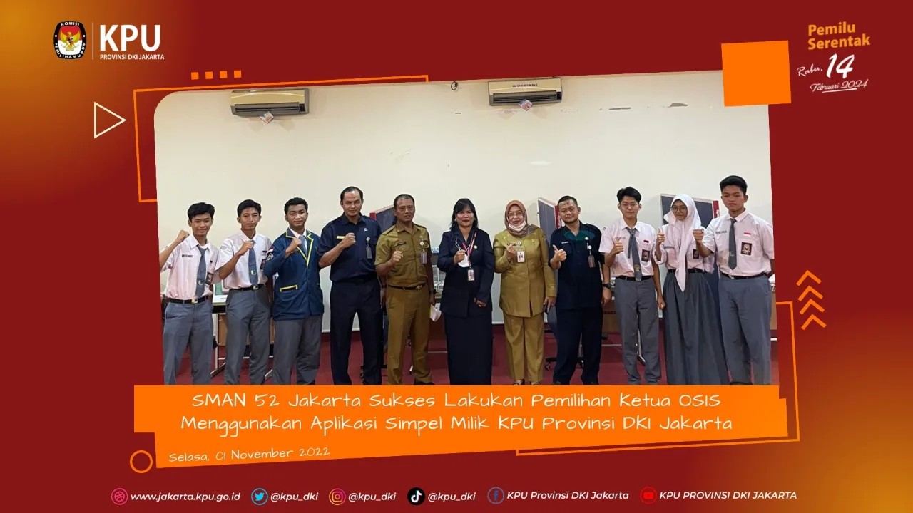Selasa, 1 November 2022 SMAN 52 Jakarta melaksanakan Pemilihan Ketua Organisasi Siswa Intra Sekolah (OSIS) Periode Tahun 2022-2023. Pelaksanaan Pemilihan berlangsung dari jam 09.00 – 14.00 WIB dengan menggunakan Sistem Pemilihan Online (SImpel) milik KPU Provinsi DKI Jakarta. Sebelum pelaksanaan pemilihan, calon pemilih harus terdaftar dalam Daftar Pemilih Tetap (DPT) dan terlebih dahulu harus melakukan registrasi. Registrasi dilakukan untuk mendapatkan akun dan password bagi pemilih yang nantinya akan digunakan untuk memilih pada saat waktu pemilihan sudah dibuka dalam aplikasi Simpel. Dalam pantauan KPU Provinsi DKI Jakarta, pelaksanaan Pemilihan Ketua OSIS ini berlangsung lancar, aman dan sukses. Calon pemilih tampak mengantri untuk melakukan pemilihan di bilik suara yang sengaja disediakan dan dilengkapi dengan komputer untuk melakukan pemilihan. Sebenarnya dalam Simpel pemilih bisa menggunakan hak pilihnya di manapun berada, asalkan sudah melakukan registrasi, karena aplikasi Simpel ini dirancang untuk melakukan pemilihan secara online. Namun untuk mempermudah dan meramaikan pelaksanaan pemilihan sengaja disediakan 3 buah bilik suara. Antusias pemilih juga bisa dilihat dari jumlah peserta yang melakukan registrasi yang dibuka sejak hari Sabtu, 29 Oktober sampai dengan Selasa, 1 November 2022. Registrasi peserta secara otomatis tertutup saat waktu pencoblosan/pemilihan dimulai yakni pukul 09.00 WIB. Registrasi bisa dilakukan dengan menggunakan personal computer (PC), laptop atau smart phone masing-masing dengan membuka link registrasi https://simpelkpujakarta.id. Sesaat setelah registrasi, calon pemilih langsung mendapatkan akun dan passwordnya yang akan digunakan untuk memilih. Dari data yang masuk, diperoleh informasi bahwa dalam Pemilihan Ketua OSIS ini Daftar Pemilih Tetap (DPT) berjumlah 939 pemilih. Yang melakukan registrasi 932 pemilih dan yang menggunakan hak pilih 898 pemilih. Dalam Pemilu OSIS SMAN 52 ini ada 5 calon yang mengajukan diri, dan Setelah dilakukan pemilihan diperoleh hasil, Calon Nomor 1 mendapat 394 suara, Calon Nomor 2 memperoleh 235 suara, Calon Nomor 3 meraiih 127 suara, Calon Nomor 4 mendapat 70 suara, dan Calon Nomor 5 menggapai 72 suara. Dari perolehan suara tersebut, Calon Nomor 1 yang berhasil menjadi peraih suara terbanyak dalam Pemilu OSIS ini. Sebelum pelaksanaan pemilihan, SMAN 52 terlebih dahulu melakukan ujicoba penggunaan aplikasi Simpel pada Jum’at, 28 Oktober 2022 yang diikuti oleh perwakilan siswa dan guru calon pemilih yang sudah masuk dalam Daftar Pemilih Tetap (DPT). Dalam ujicoba tersebut, Ketua Divisi Sosialisasi, Pendidikan Pemilih, dan Partisipasi Masyarakat KPU Provinsi DKI Jakarta Marlina mengungkapkan keunggulan pemilihan menggunakan aplikasi ini, yakni di antaranya melalui aplikasi ini pemilihan dapat dilakukan di mana pun hanya dengan menggunakan gadget yang dimiliki oleh para siswa. Aplikasi Simpel ini juga menjamin pemilih tidak bisa memilih lebih dari sekali. Sebagai informasi, SMAN 52 ini menjadi pilot project Pemilihan Ketua OSIS yang dilakukan secara online oleh Dinas Pendidikan Provinsi DKI Jakarta. Sebelumnya aplikasi Simpel ini juga sukses digunakan dalam Pemilu Raya Badan Ekseskutif Mahasiswa (BEM) Universitas Indonusa Esa Unggul pada tahun 2021 lalu.