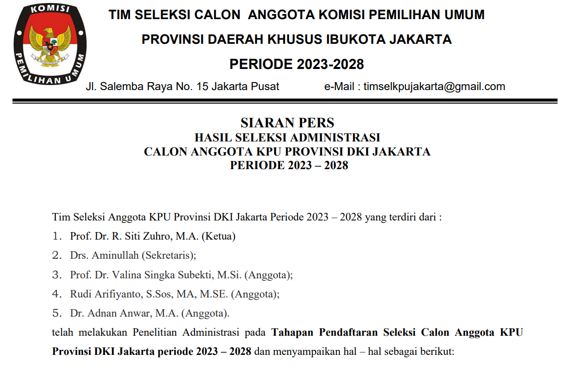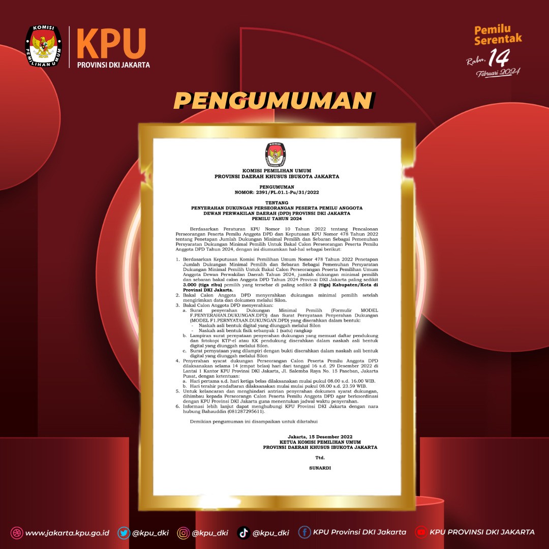 KPU Provinsi DKI Jakarta telah menerima Data Penduduk Potensial Pemilih Pemilu (DP4) hasil sinkronisasi sesuai dengan Surat Ketua KPU RI Nomor 13/TIK.04-SD/4/2023 tanggal 4 Januari 2023.