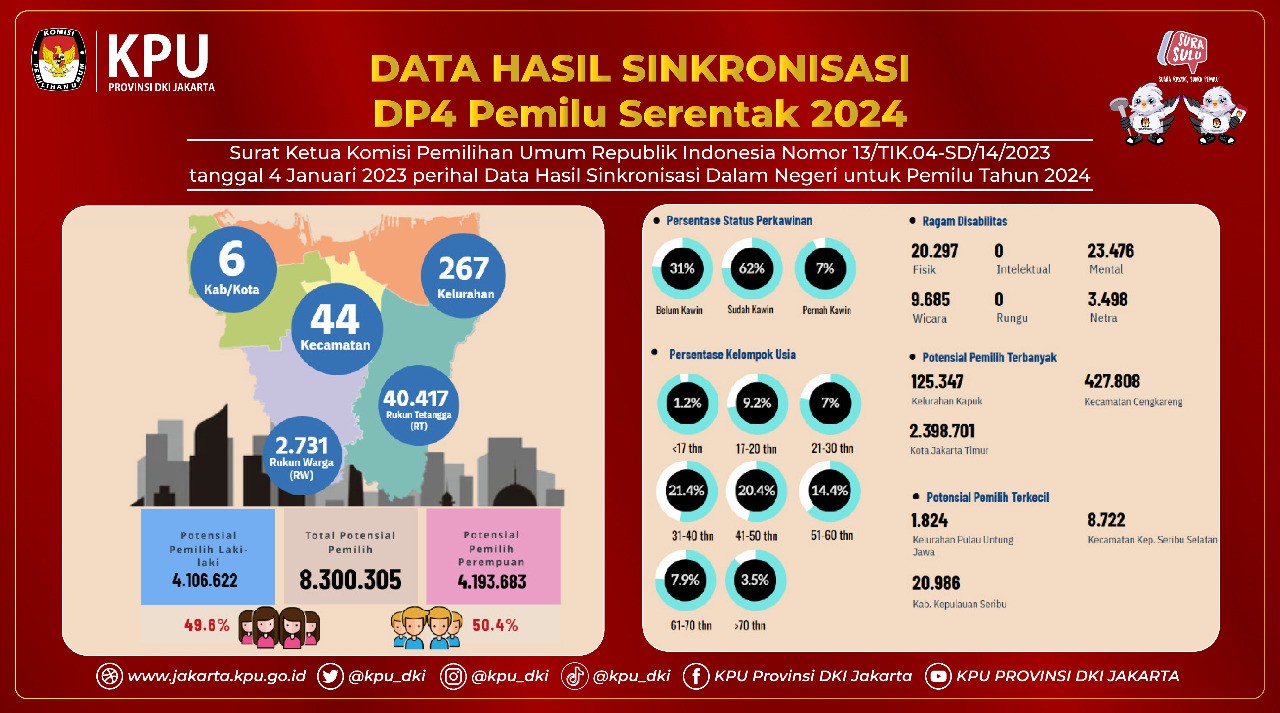 Data hasil sinkronisasi antara Data Penduduk Potensial Pemilih Pemilu (DP4) dan daftar pemutakhiran berkelanjutan di Provinsi DKI Jakarta pada Pemilu 2024 nanti mencapai 8.300.305 orang, dengan rincian, 4.106.622 pemilih laki-laki dan 4.193.683 pemilih perempuan yang tesebar di 6 kota/kabupaten, 44 Kecamatan dan 267 Kelurahan di Provinsi DKI Jakarta.