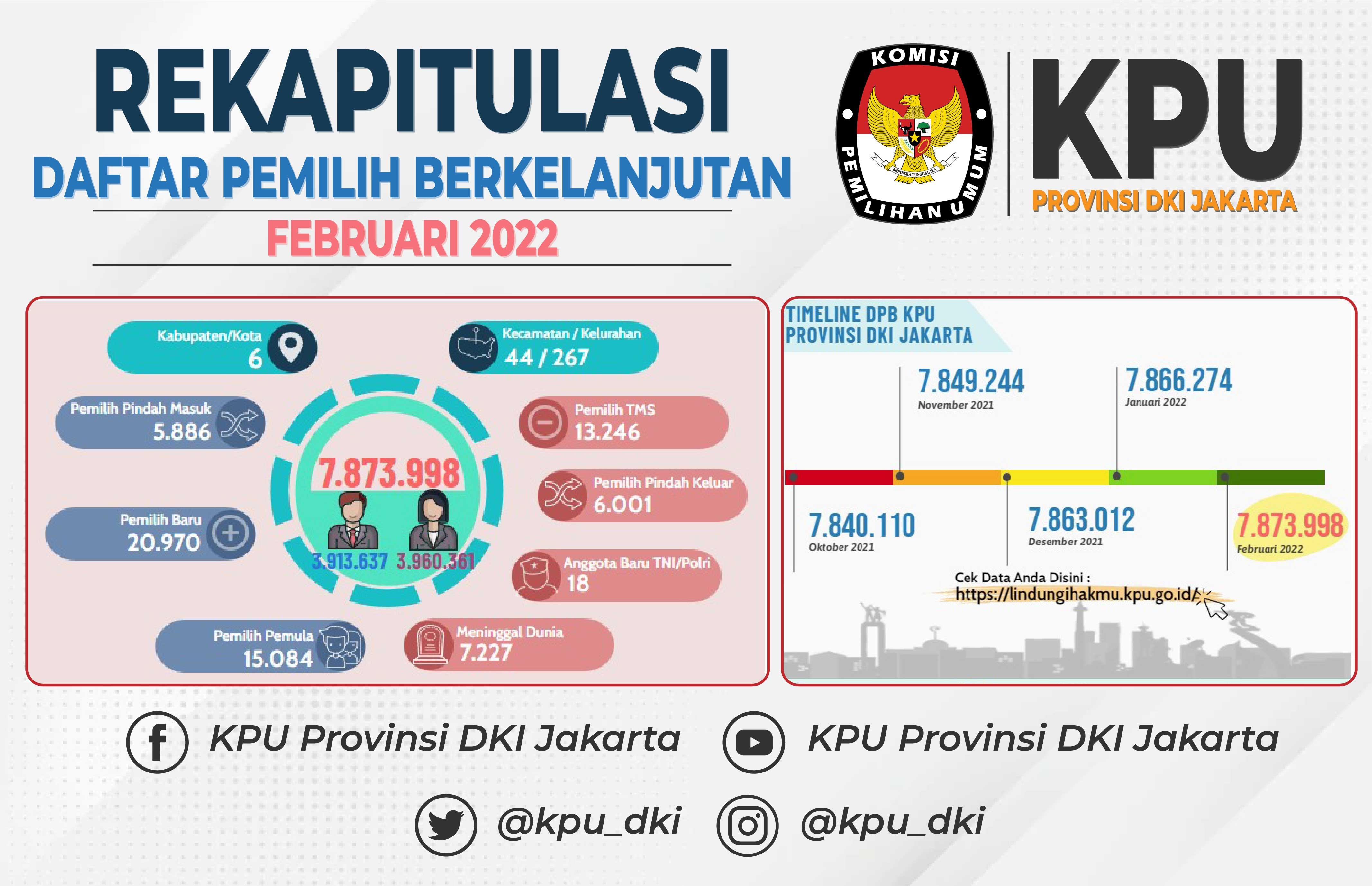 Berikut adalah Rekapitulasi Daftar Pemilih Berkelanjutan Provinsi DKI Jakarta Periode Bulan Ferbuari 2022 dengan jumlah pemilih 7.873.998.