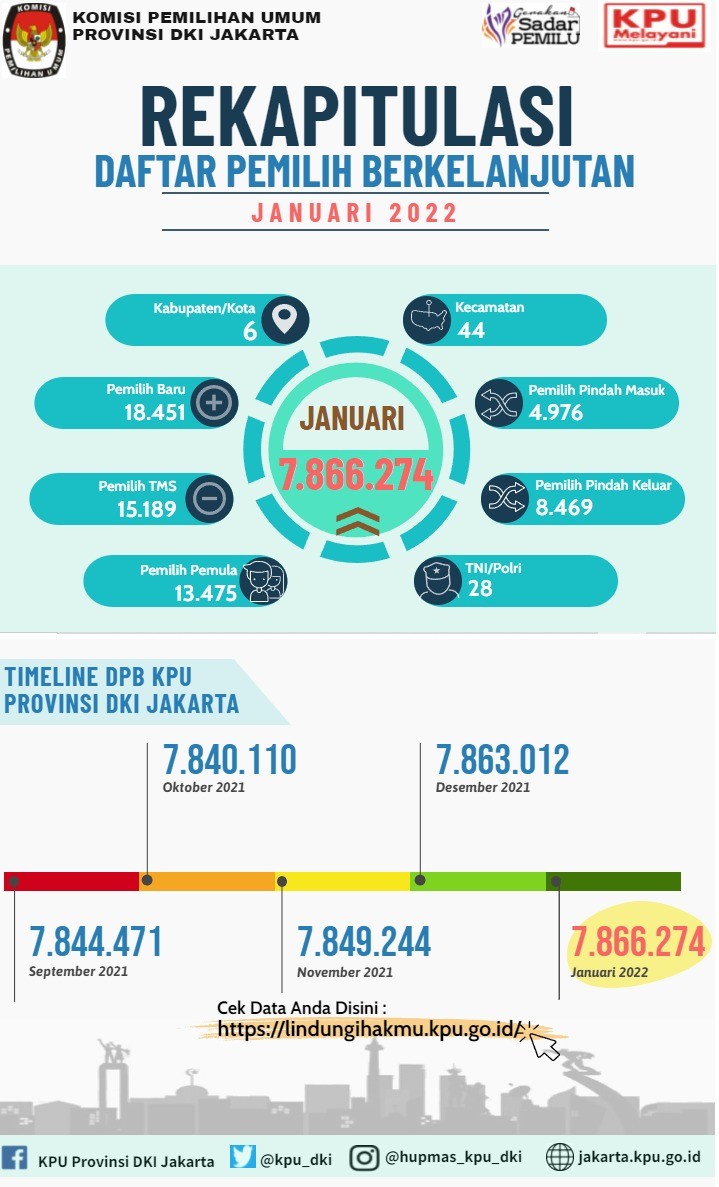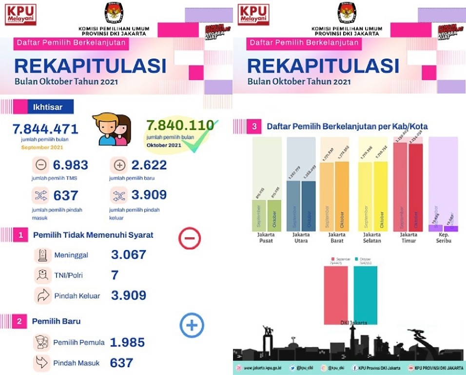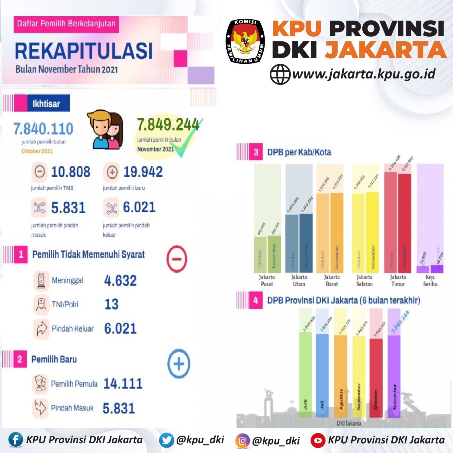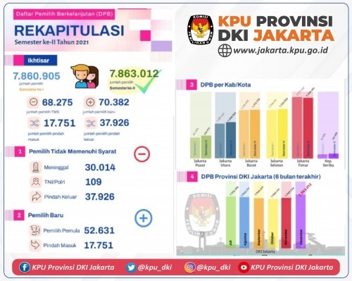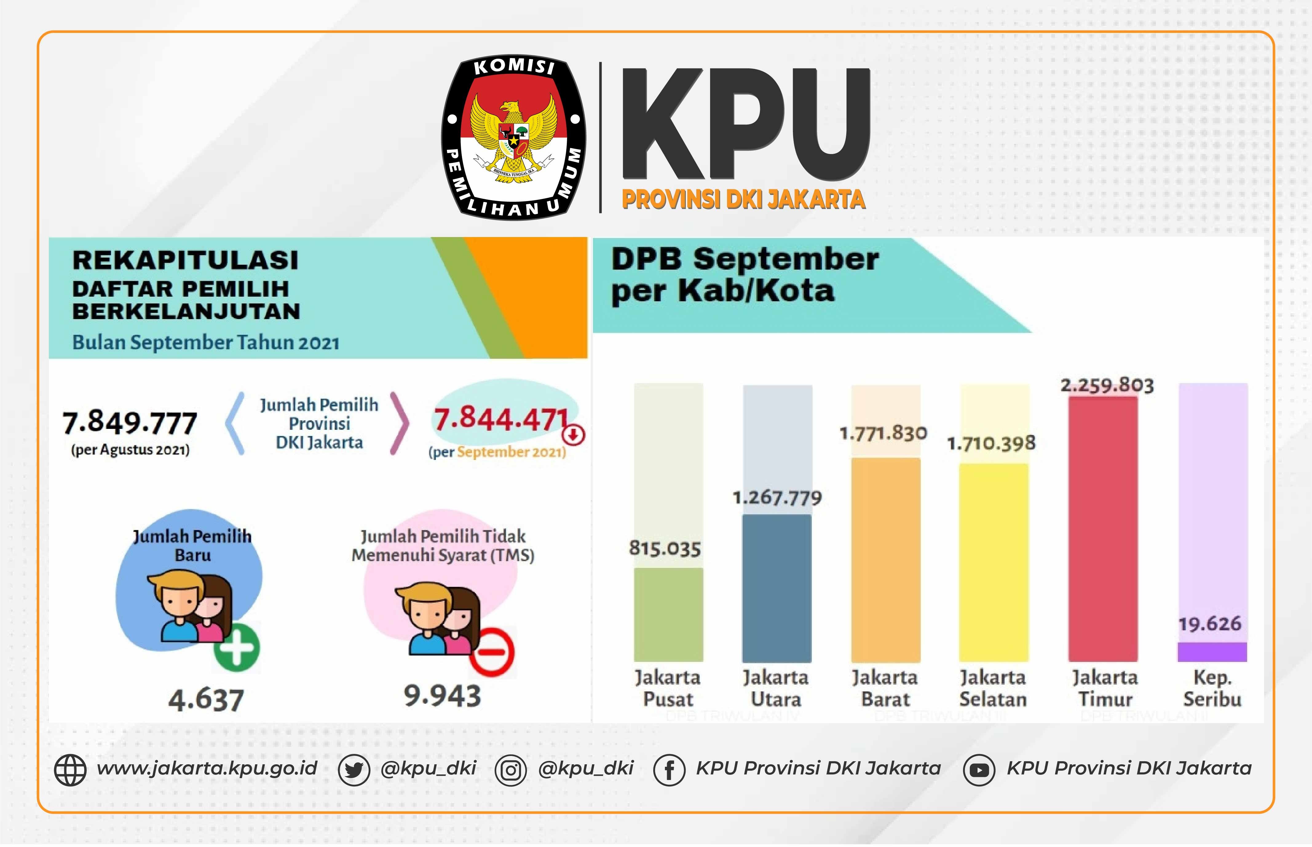 jakarta.kpu.go.id - (05/10) KPU Provinsi DKI Jakarta melakukan proses rekapitulasi Daftar Pemilih Berkelanjutan (DPB) bulan September tahun 2021 pada Senin, 4 Oktober 2021. DPB berasal dari data yang dilaporkan KPU Kabupaten/Kota se Provinsi DKI Jakarta untuk bulan September 2021. Sumber data diperoleh dari beberapa suku dinas diantaranya Dinas Dukcapil se DKI Jakarta, Dinas Pemakaman se DKI Jakarta dan dinas lainnya yang terkait.