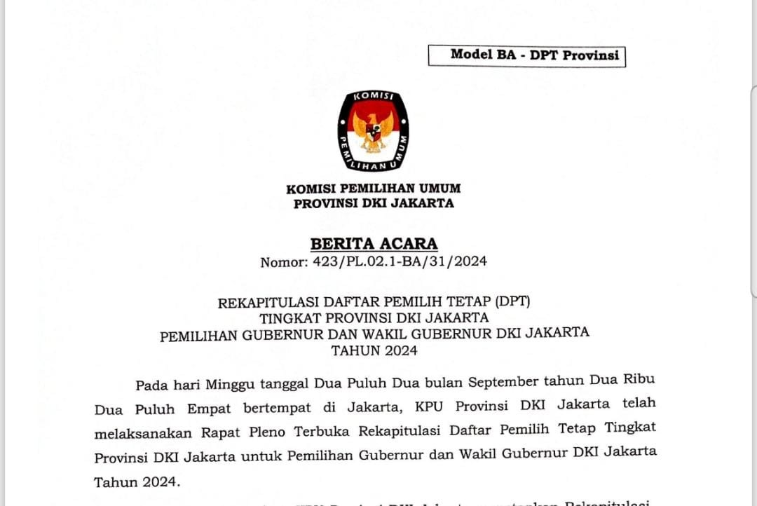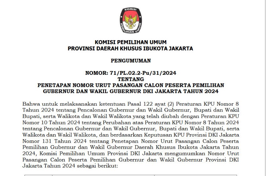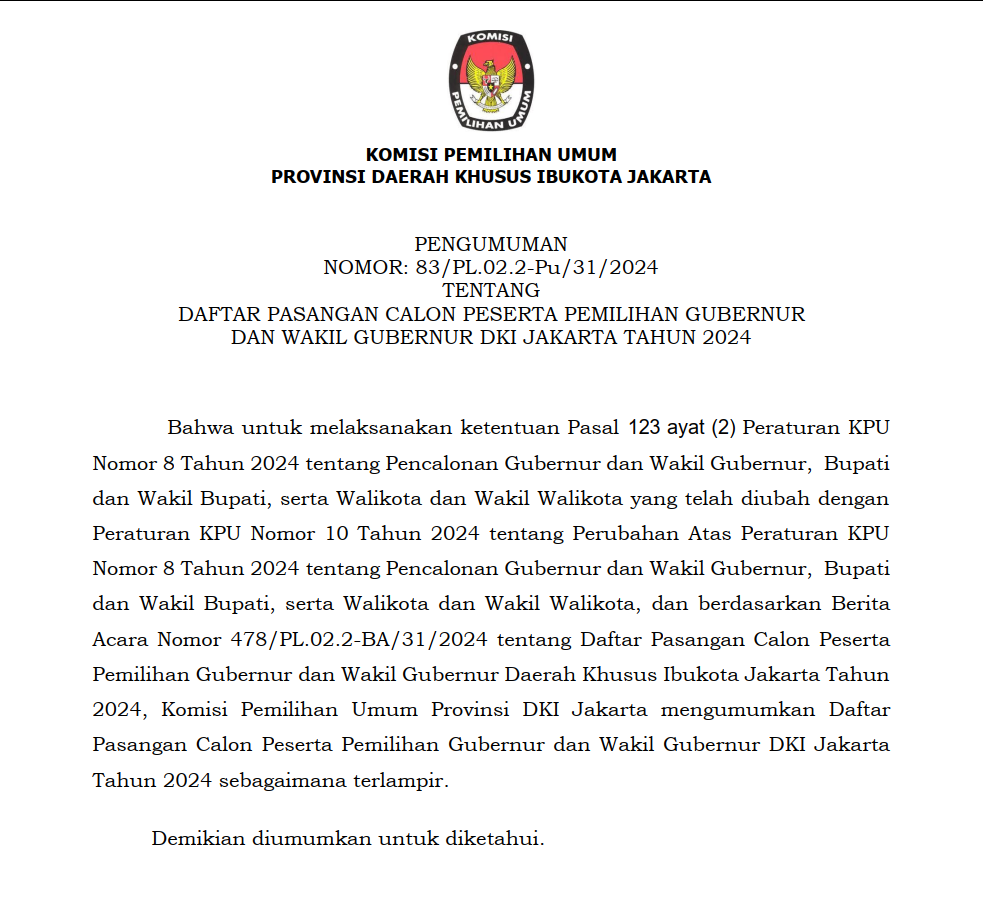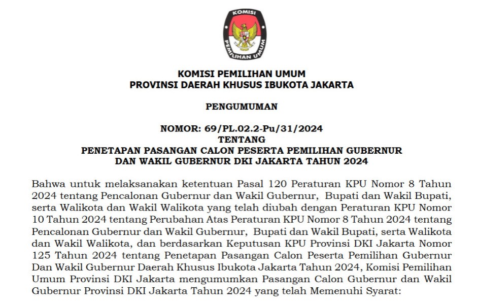 Berikut kami sampaikan Pengumuman Daftar Pasangan Calon Peserta Pemilihan Gubernur dan Wakil Gubernur DKI Jakarta Tahun 2024