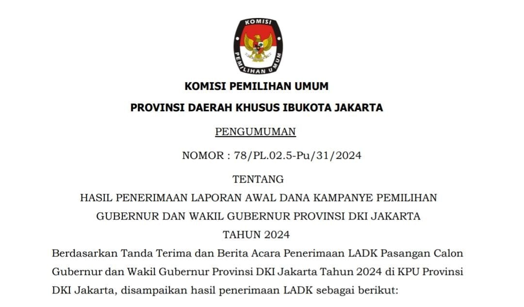 Berikut kami sampaikan Pengumuman Hasil Penerimaan Laporan Awal Dana Kampanye Pemilihan Gubernur dan Wakil Gubernur DKI Jakarta Tahun 2024.