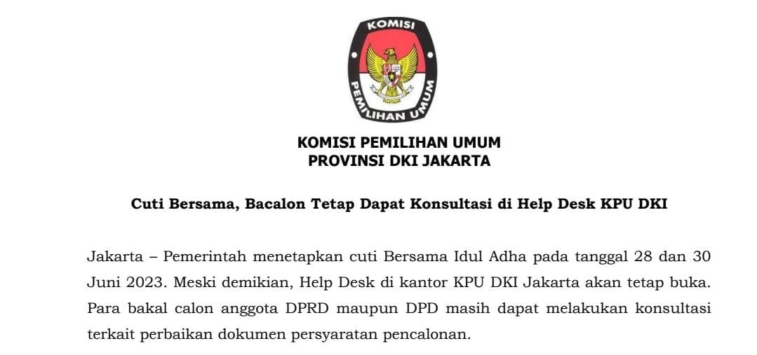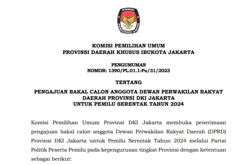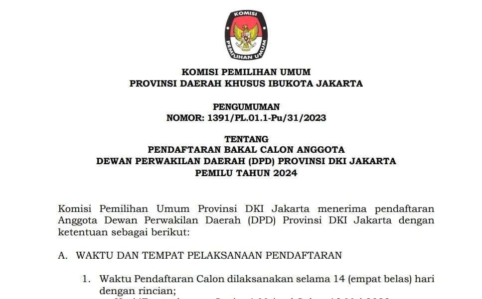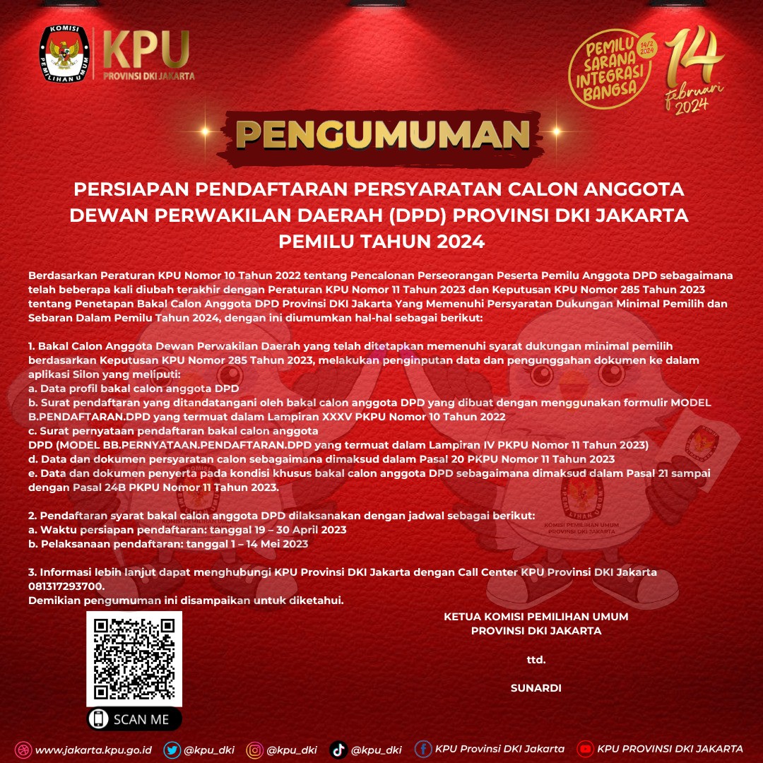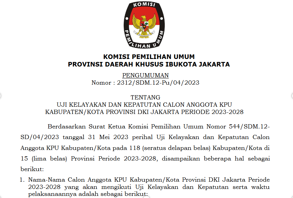 Unduh Disini PENGUMUMAN Nomor : 2312/SDM.12-Pu/04/2023 TENTANG UJI KELAYAKAN DAN KEPATUTAN CALON ANGGOTA KPU KABUPATEN/KOTA PROVINSI DKI JAKARTA PERIODE 2023-2028