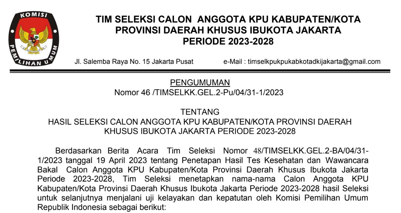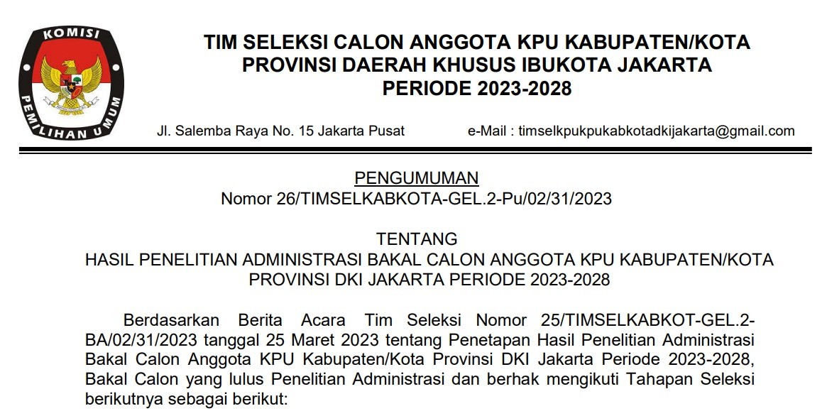 Tim Seleksi Calon Anggota KPU Kabupaten/Kota Provinsi DKI Jakarta resmi mengumumkan hasil Seleksi Administrasi Calon Anggota Komisi Pemilihan Umum Kabupaten/Kota Provinsi DKI Jakarta Periode 2023 – 2028