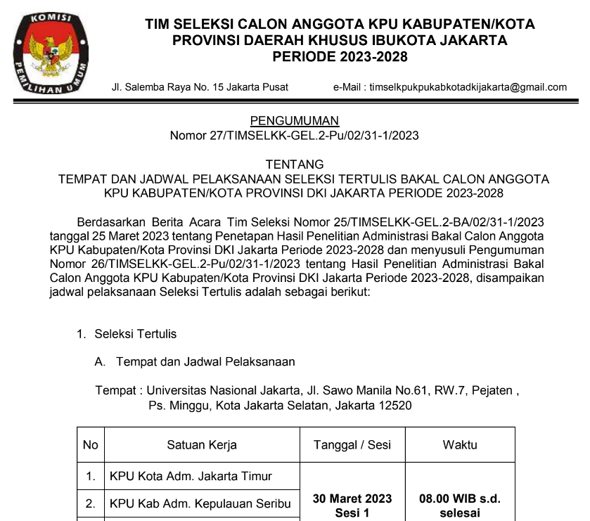 Berikut kami sampaikan Pengumuman Tempat dan Jadwal Pelaksanaan Seleksi Tertulis Bakal Calon Anggota KPU Kabupaten/Kota Provinsi DKI Jakarta Periode 2023-2028