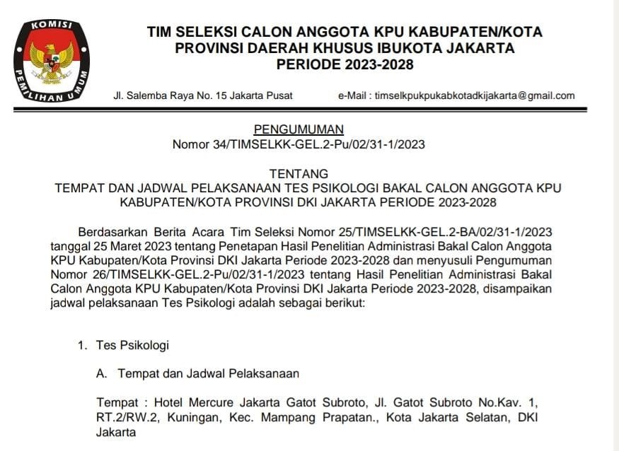 Berikut kami sampaikan Pengumuman Tempat dan Jadwal Pelaksanaan Tes Psikologi Bakal Calon Anggota KPU Kabupaten/Kota Provinsi DKI Jakarta Periode 2023-2028