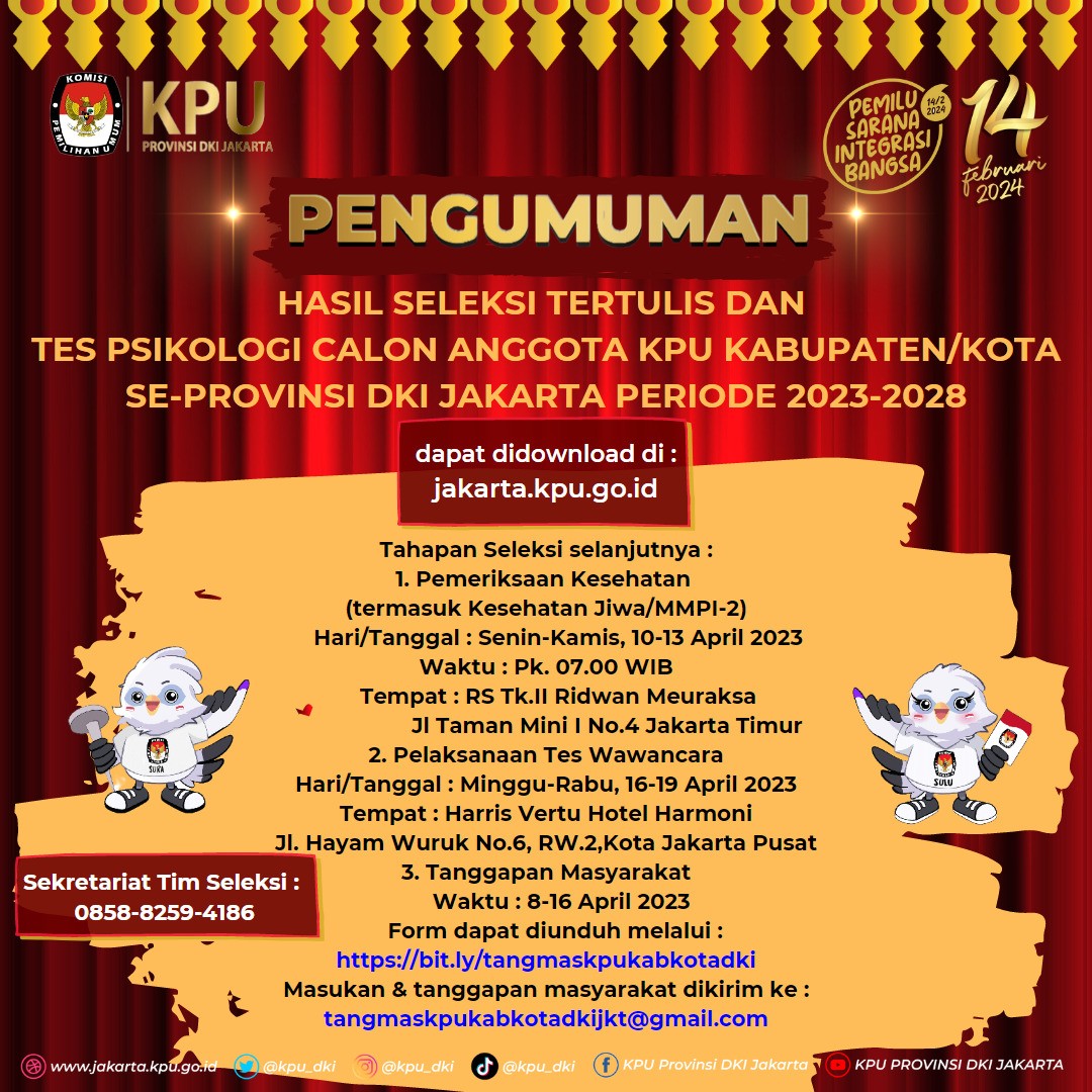 Berikut kami sampaikan Pengumuman Hasil Seleksi Tertulis dan Tes Psikologi Calon Anggota KPU Kabupaten/Kota Provinsi DKI Jakarta Periode 2023-2028
