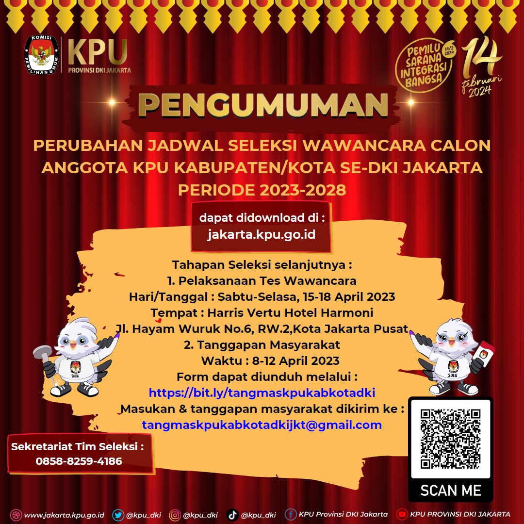 Berikut kami sampaikan Pengumuman Perubahan Jadwal Tes Wawancara Calon Anggota KPU Kabupaten/Kota Provinsi DKI Jakarta Periode 2023-2028